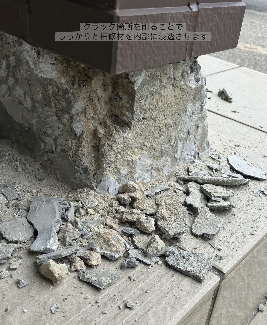 今回はクラック箇所を削ることでしっかりと補修材を内部に浸透させました。
