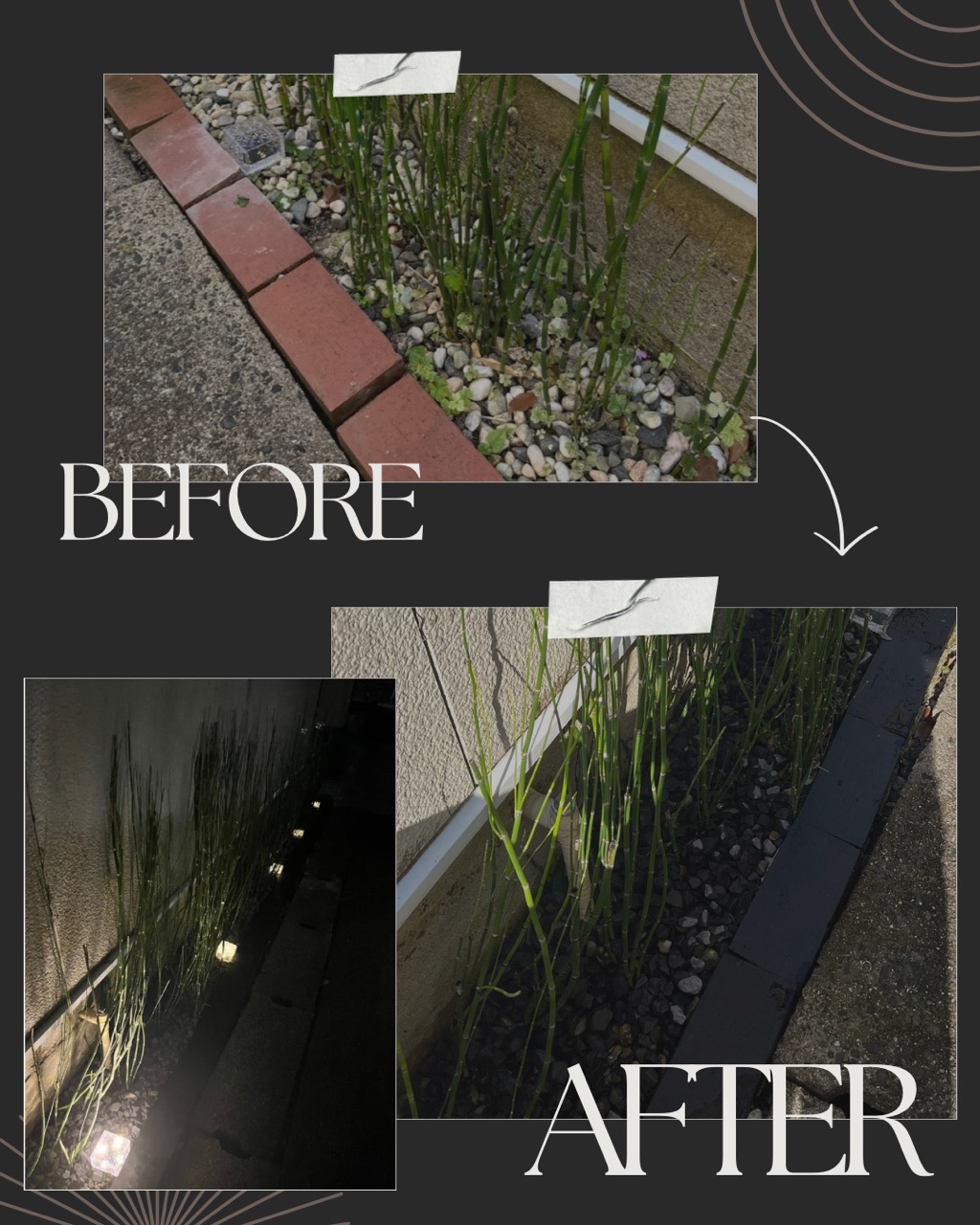 ☝🏻庭のレンガは色を塗り、黒い砕石をトクサの足元にまきました